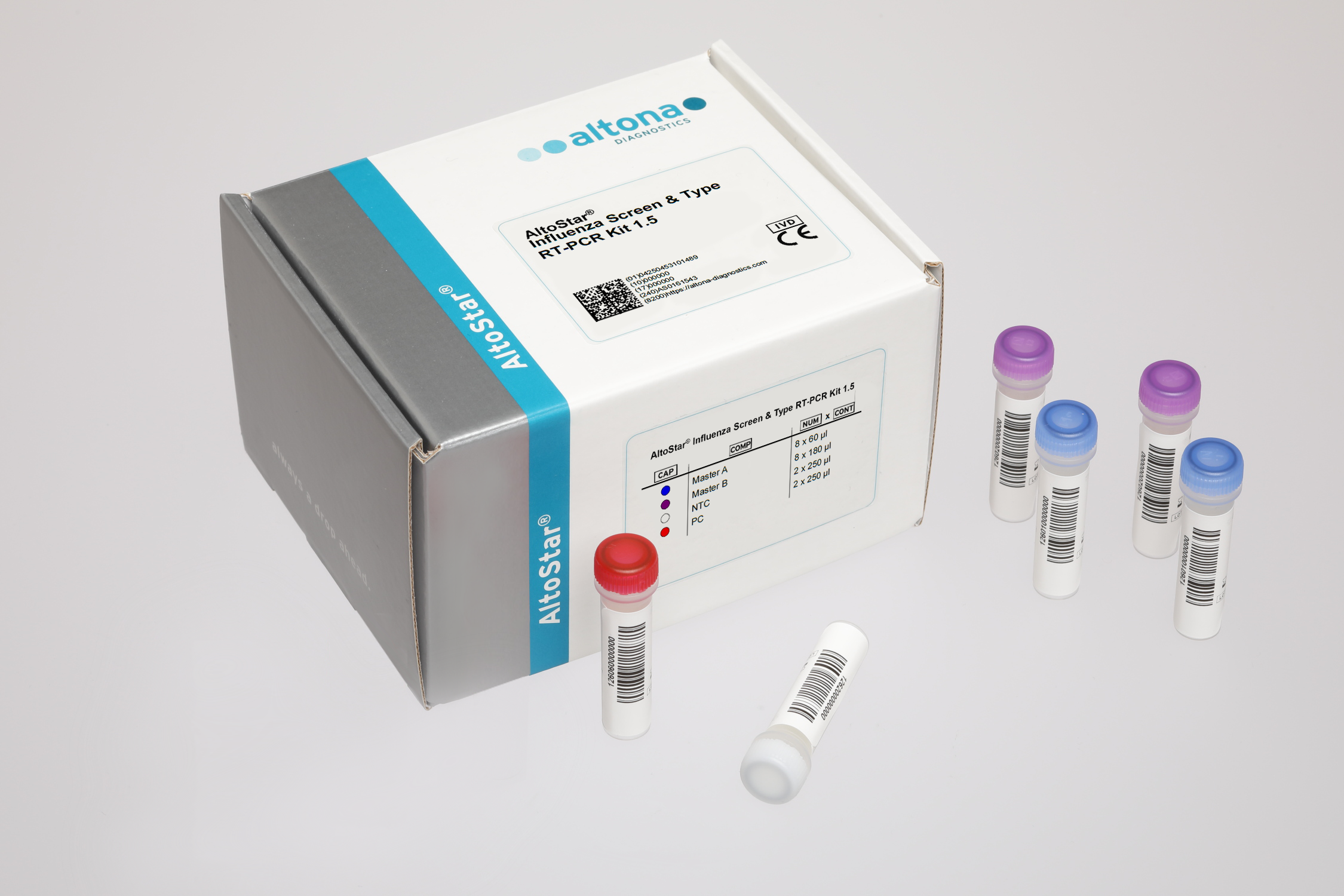 The AltoStar® Influenza Screen & Type RT-PCR Kit 1.5 is an in vitro diagnostic test, based on real-time PCR technology, for the qualitative detection and differentiation of influenza A virus, influenza B virus and influenza A (H1N1)pdm09 virus specific RNA in human respiratory swab specimens. It is intended to be used as an aid for diagnosis of influenza A, influenza B and influenza A (H1N1)pdm09 virus infection.