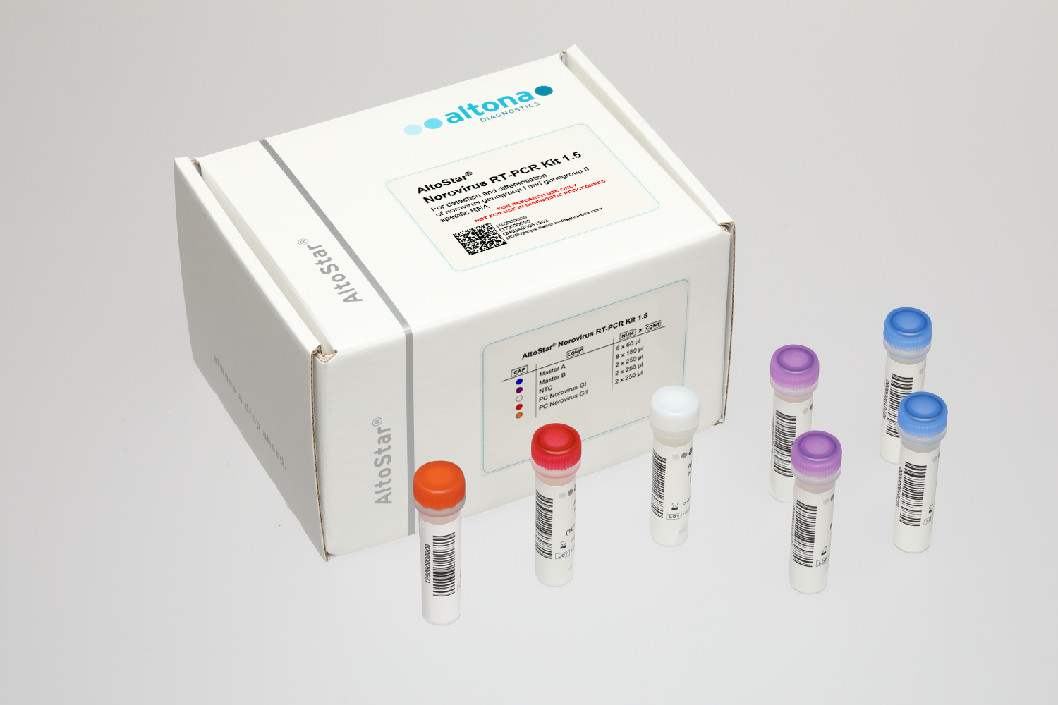 The AltoStar® Norovirus RT-PCR Kit 1.5 is a reagent system, based on real-time PCR technology, for detection and differentiation of norovirus GI and GII specific RNA.