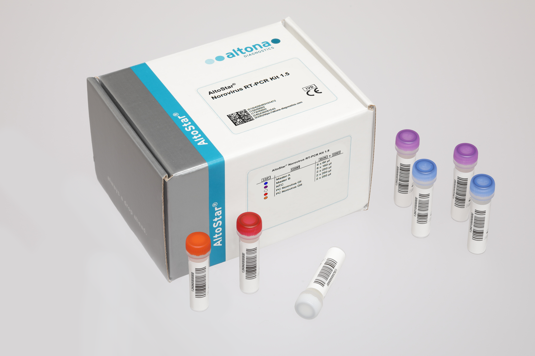 The AltoStar® Norovirus RT-PCR Kit 1.5 is an in vitro diagnostic test, based on real-time PCR technology, for the qualitative detection and differentiation of norovirus genogroup I (GI) and II (GII) specific RNA in human stool samples. It is intended to be used as an aid for diagnosis of norovirus infection.